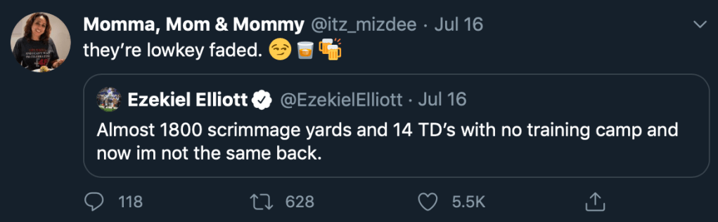 Partying is a competitive sport for most bros and Zeke has been no exception throughout all his prior offseasons. This year however, he’s been forced to channel that energy into video games and has had the quietest summer since he’s been drafted. That hasn’t stopped scumbag outlets like SI from continuing to slander his name, so we’re getting used to the fact that people will be after his character for the rest of his career.